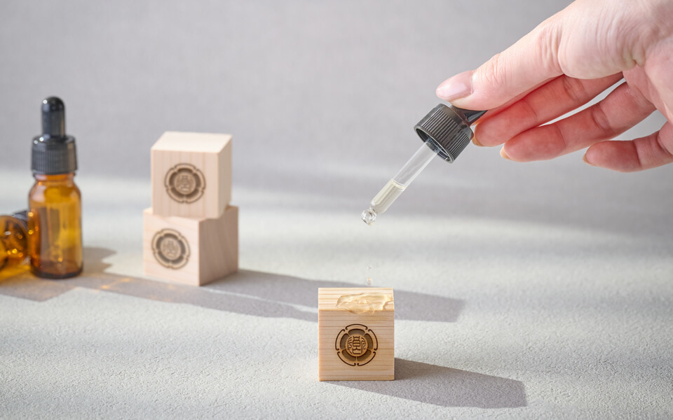 岐阜県産の自然素材の精油を使い、刻印入りのアロマウッドにお好みの香りを染み込ませます。枕元やテーブルのそばに置くだけで木のぬくもりと香りがやさしく広がり、心がふっとほどけるような癒しの時間に。「アスナロ木×レモン」は心身をリフレッシュさせる香り、「ヒノキ×ユズ」は心を穏やかにしながら気分を明るくする香りなど、お気に入りの香りの調合を愉しめます。