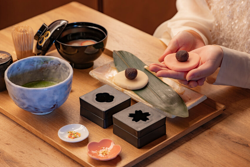 囲炉裏のある小上がりのスペースにて、練りきり体験を実施いたします。自分で点てる抹茶とともに、和菓子文化の奥深さをご体感ください。