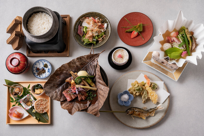 奥美濃古地鶏や飛騨豚など、岐阜県産の食材にこだわったディナーコースをご用意しました。ご飯には鮎と桜の香りの炊き込み羽釜ご飯をご用意し、羽釜ならではのふっくらとした炊き上がりをご堪能いただけます。