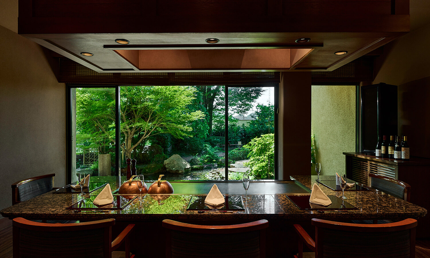 松風庵の鉄板焼でご用意するスペシャルコース。活鮑やオマール、飛騨牛サーロインなど豪華食材を目の前で焼き上げる鉄板焼きコース10品。ランチ/ディナーそれぞれ各時間1組限定でごゆっくりお過ごしいただけます。