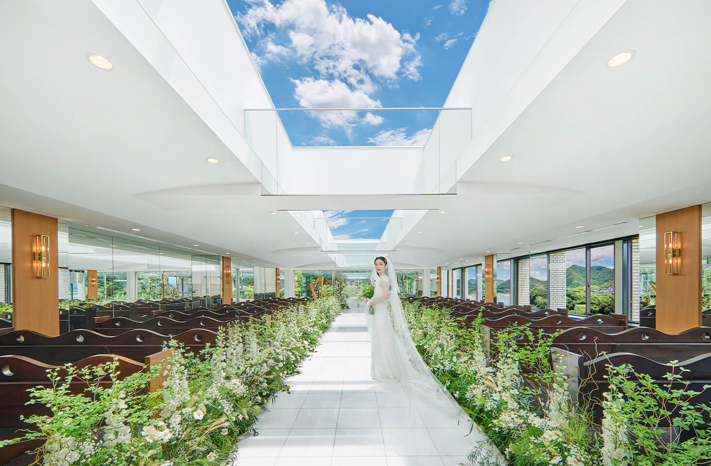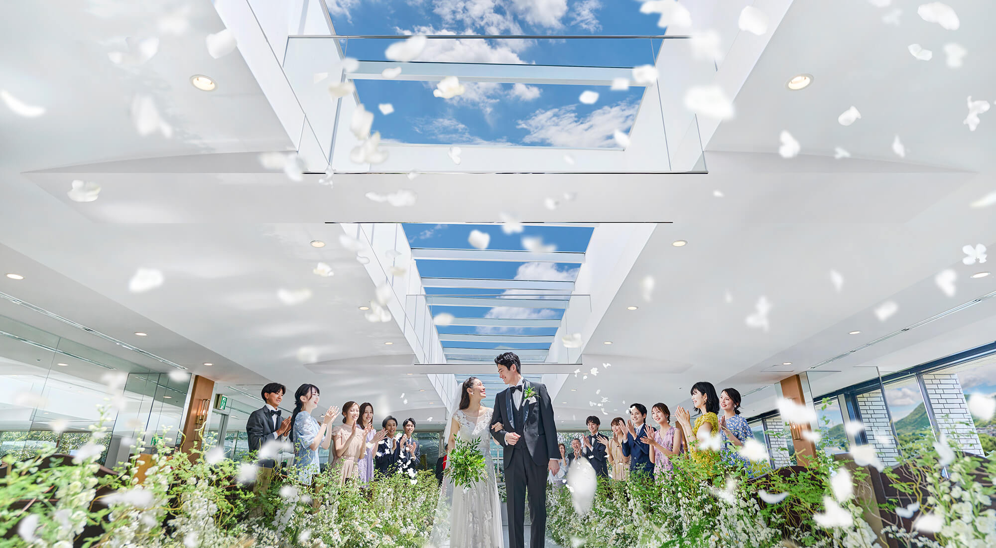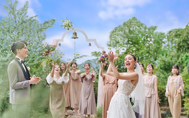 青空が広がる開放的なロケーションで、幸せを分かち合う特別なブーケトスが叶います。自然の中で思い出に残るひとときをお楽しみください。