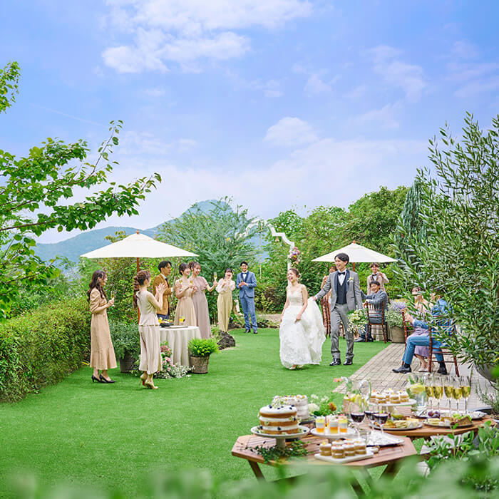緑あふれるガーデンセレモニーで、自然に囲まれた特別な瞬間を演出。笑顔や感動が自然とあふれる特別な時間。