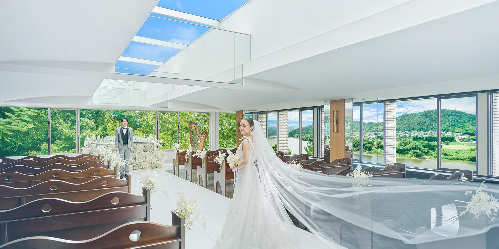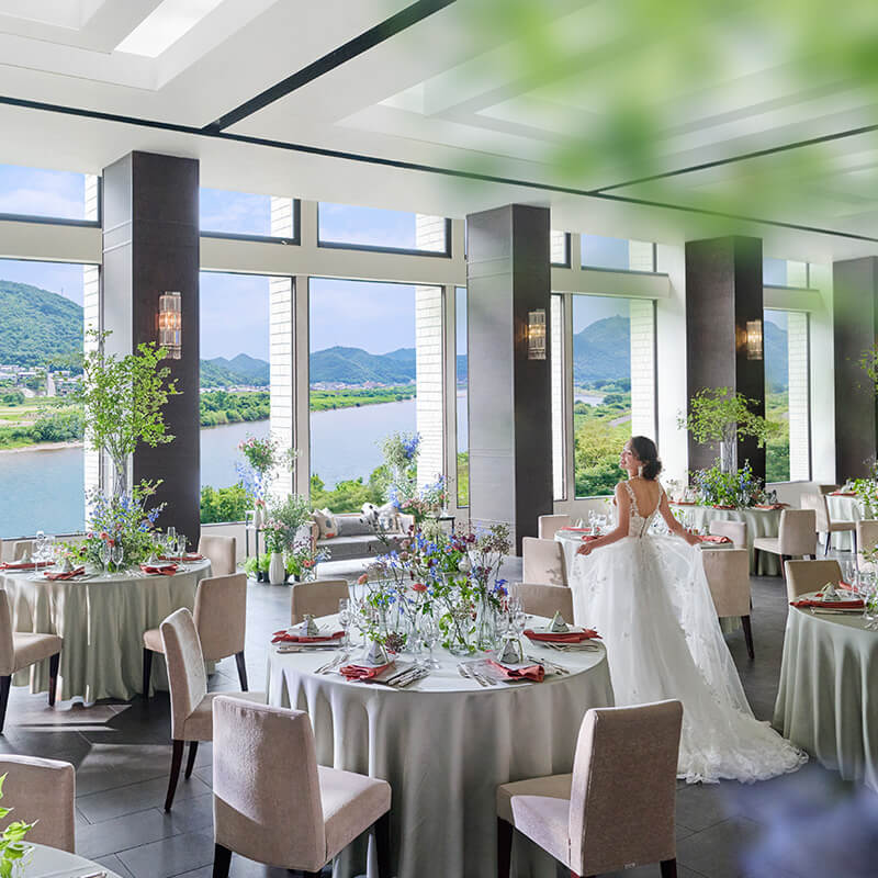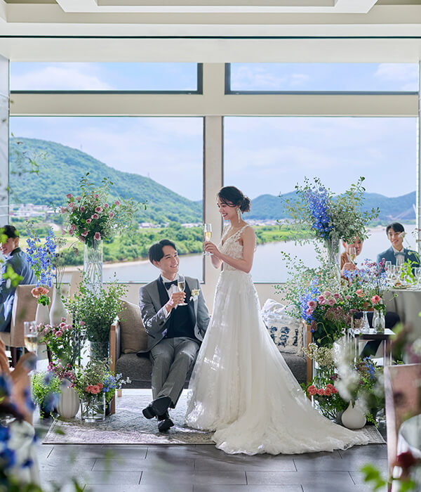 挙式・披露宴会場からは、長良川と金華山が織りなす壮麗な景色が広がります。故郷への感謝が心に自然と浮かぶロケーションは、背筋が伸びる挙式にふさわしい場です。